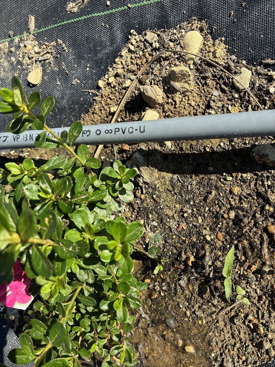 そして、雨水タンクから、パイプを通って水が流れ、きちんと樹の根元に水がかかるようにパイプに穴をあけて