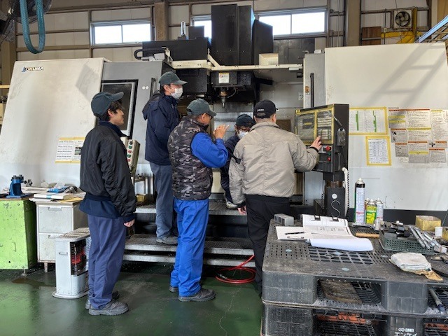 菊川工場が誇る加工メンバー達が、真剣な顔でオークマミラックのプログラムをのぞき込んでいる。